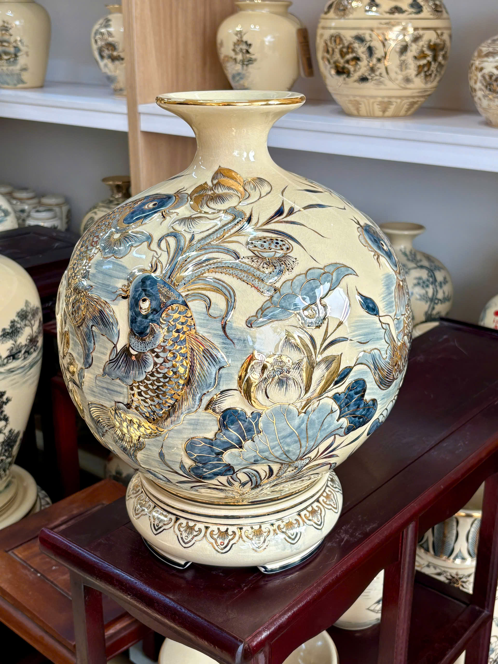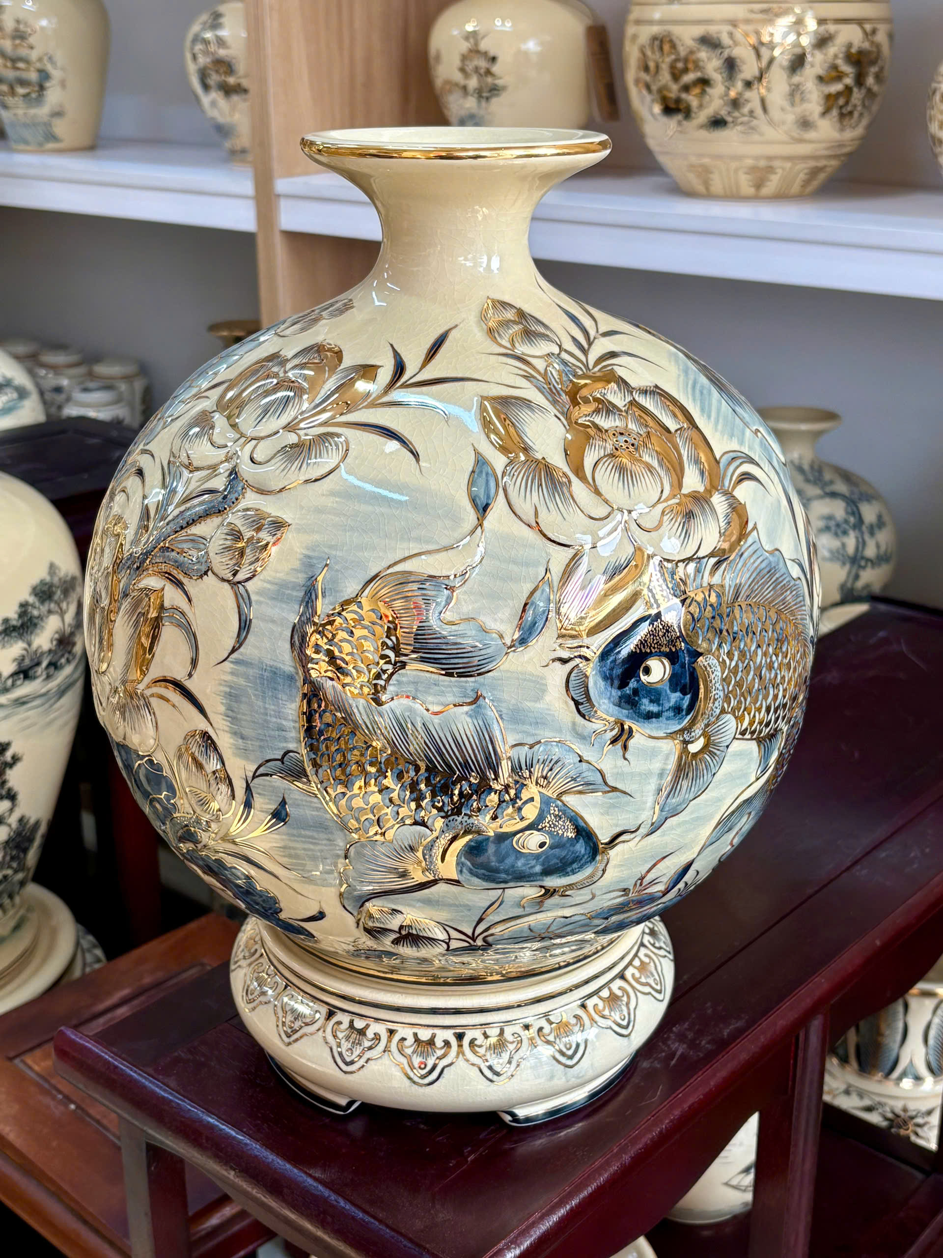 Bình Hút Tài Lộc Cá Chép Hoa Sen H35 Đắp Nổi Gốm Chu Đậu Vẽ Vàng 24K - Tinh Hoa Phong Thủy Việt