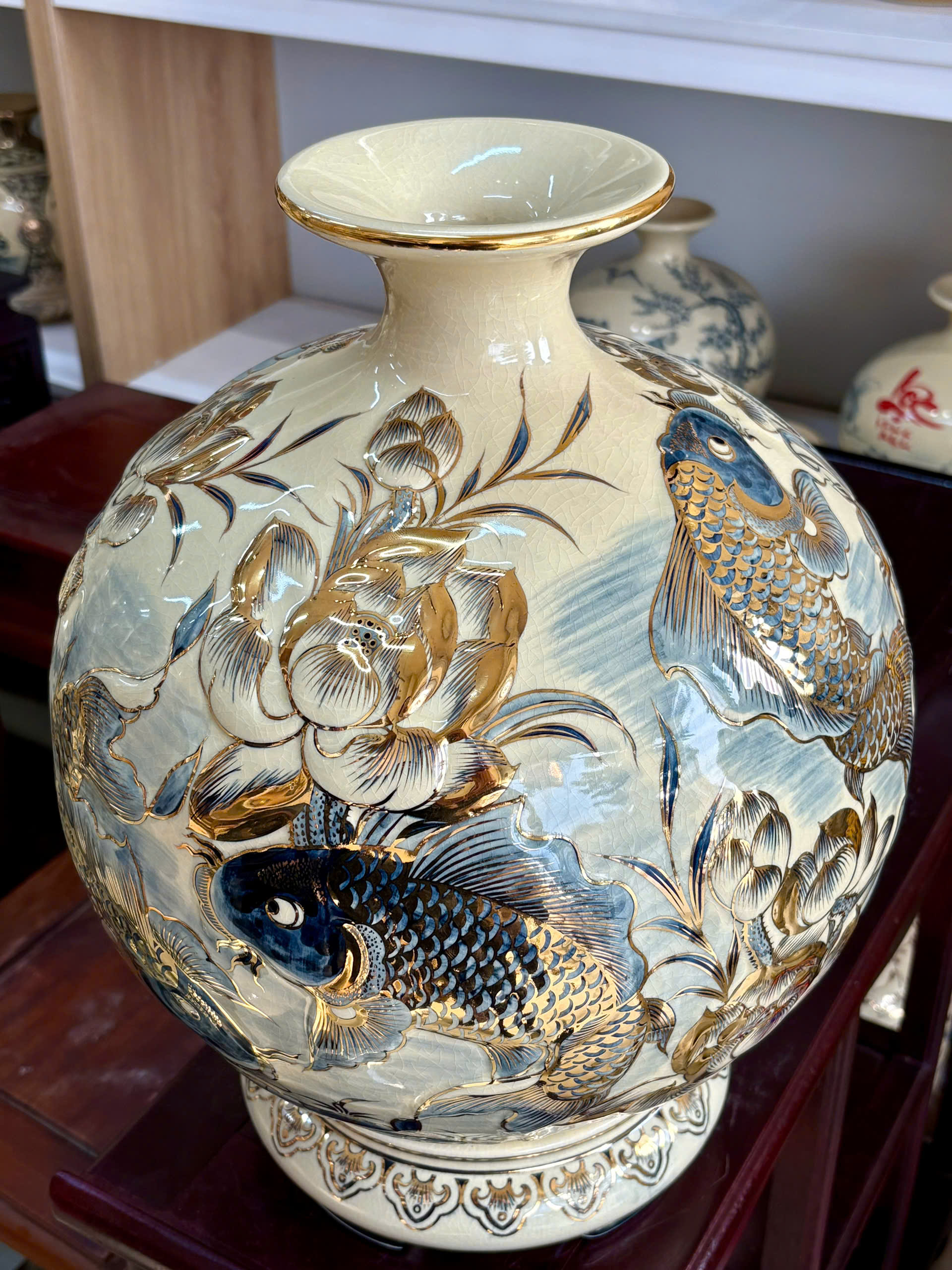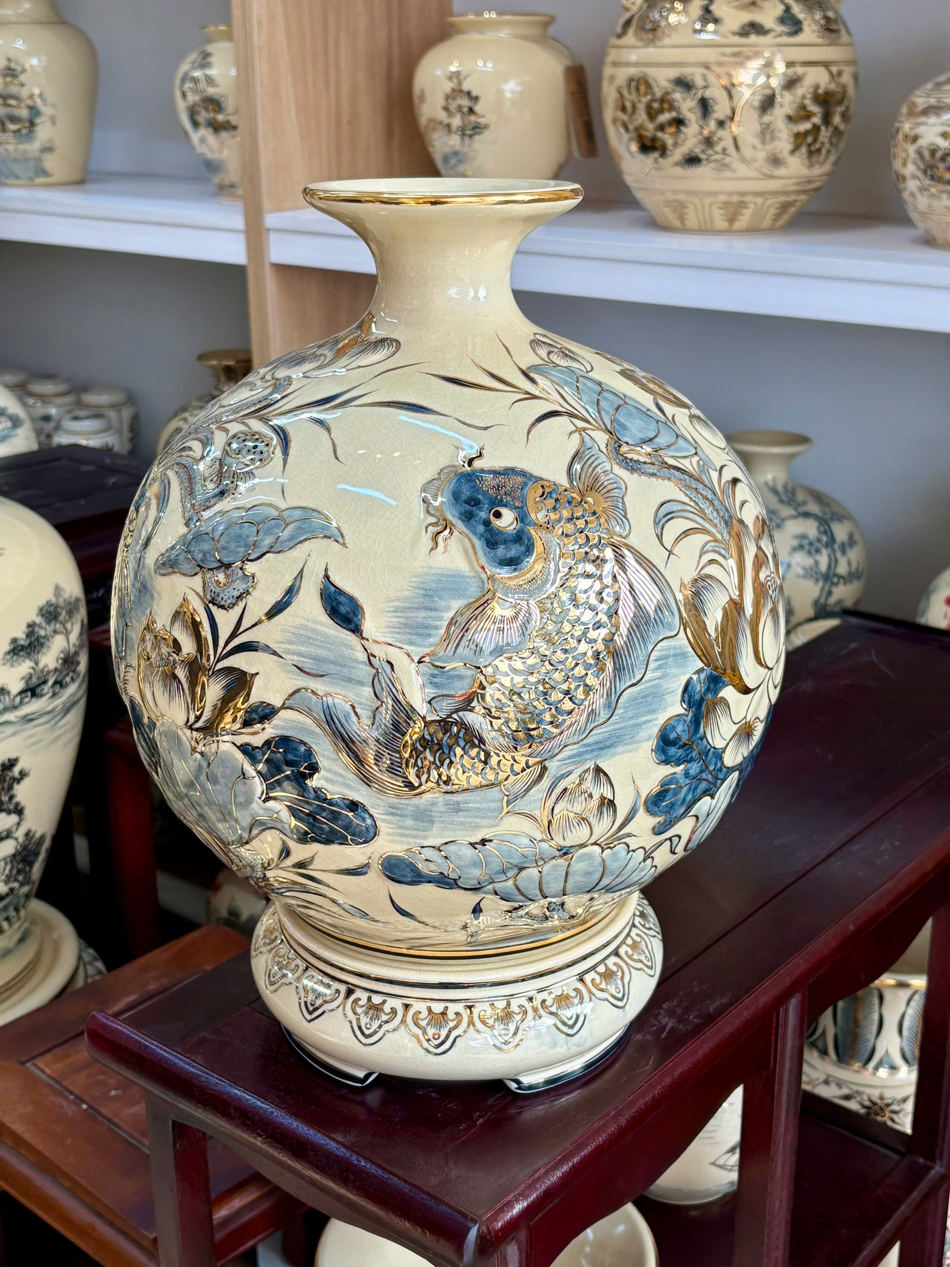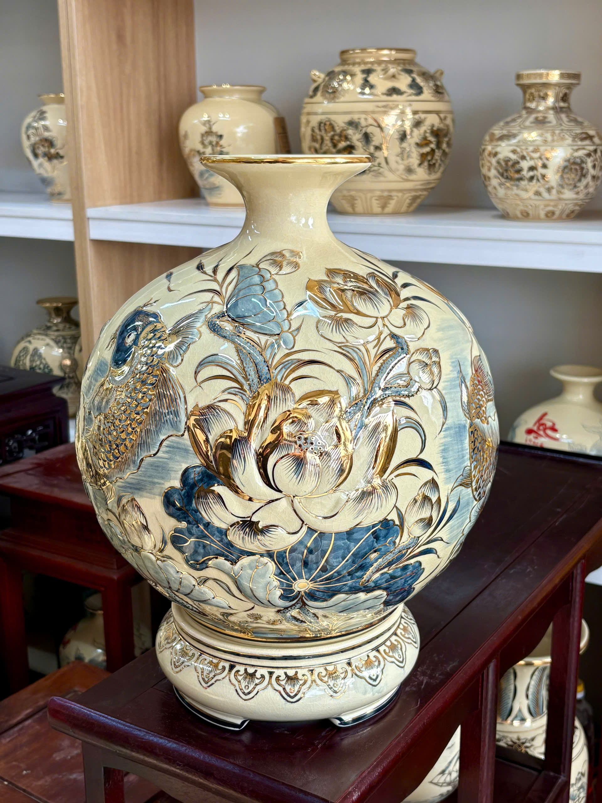 Bình Hút Tài Lộc Cá Chép Hoa Sen H35 đắp nổi gốm Chu Đậu vẽ vàng 24K là sự kết hợp hoàn hảo giữa nghệ thuật gốm sứ tinh xảo và ý nghĩa phong thủy sâu sắc. Với hình ảnh cá chép và hoa sen biểu tượng cho sự thịnh vượng, may mắn và thanh cao, sản phẩm không chỉ là vật phẩm trang trí sang trọng mà còn là món quà phong thủy ý nghĩa dành cho gia đình, doanh nghiệp.