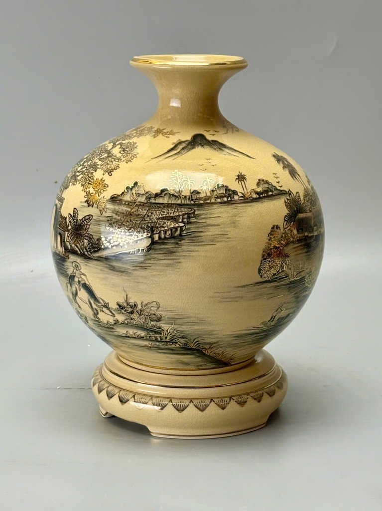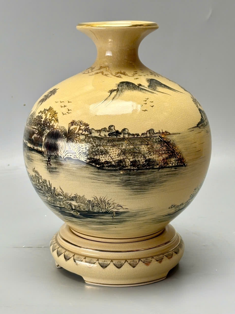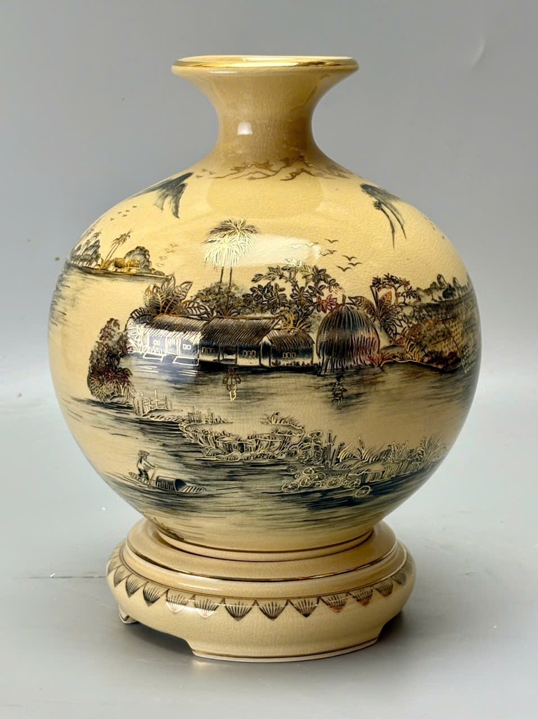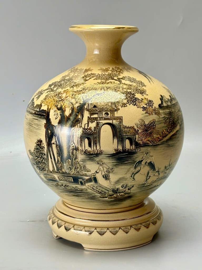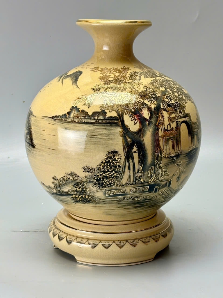 🌾 Bình Hút Tài Lộc Cảnh Đồng Quê H25 – Gốm Chu Đậu Vẽ Vàng 24K