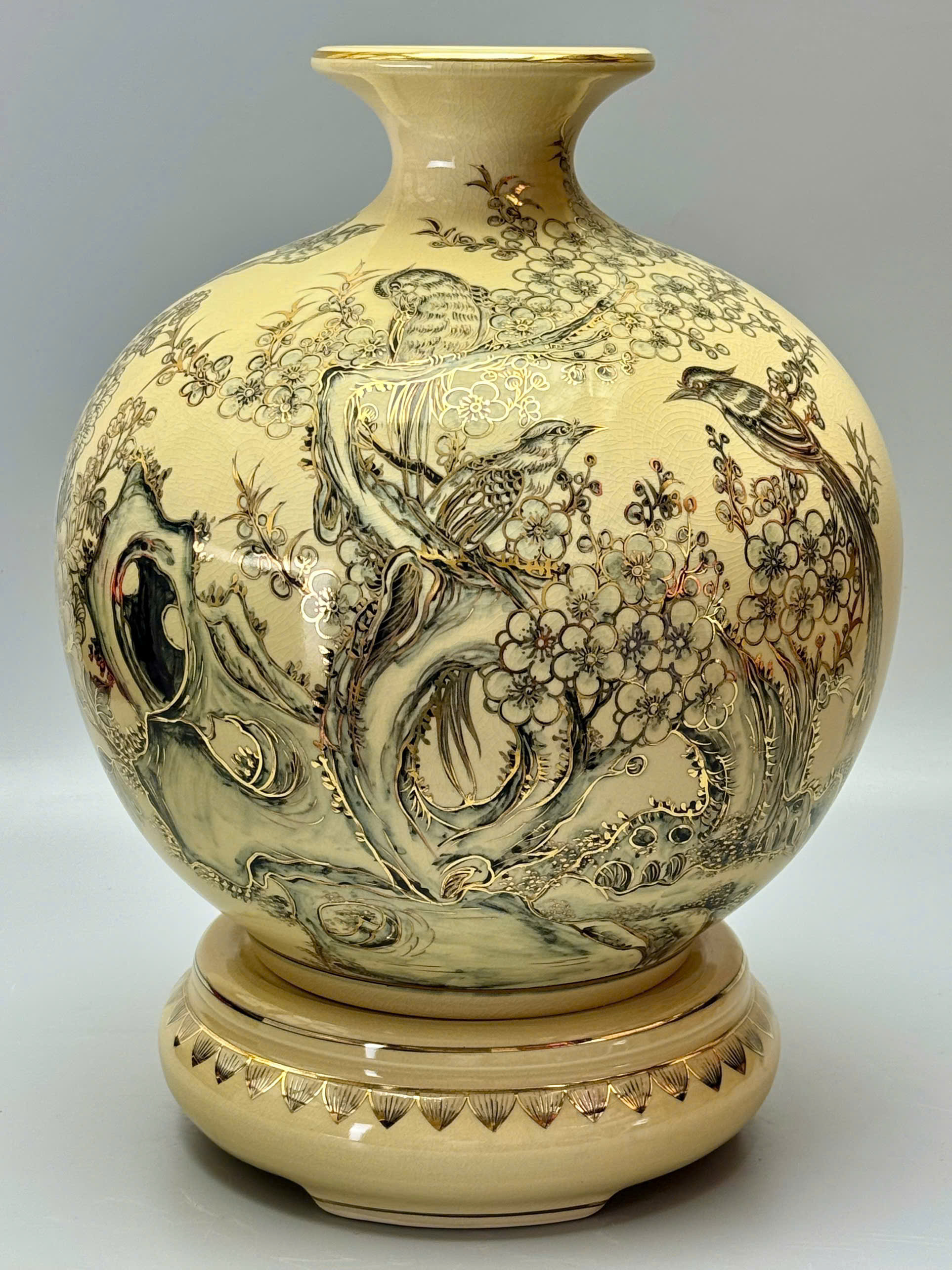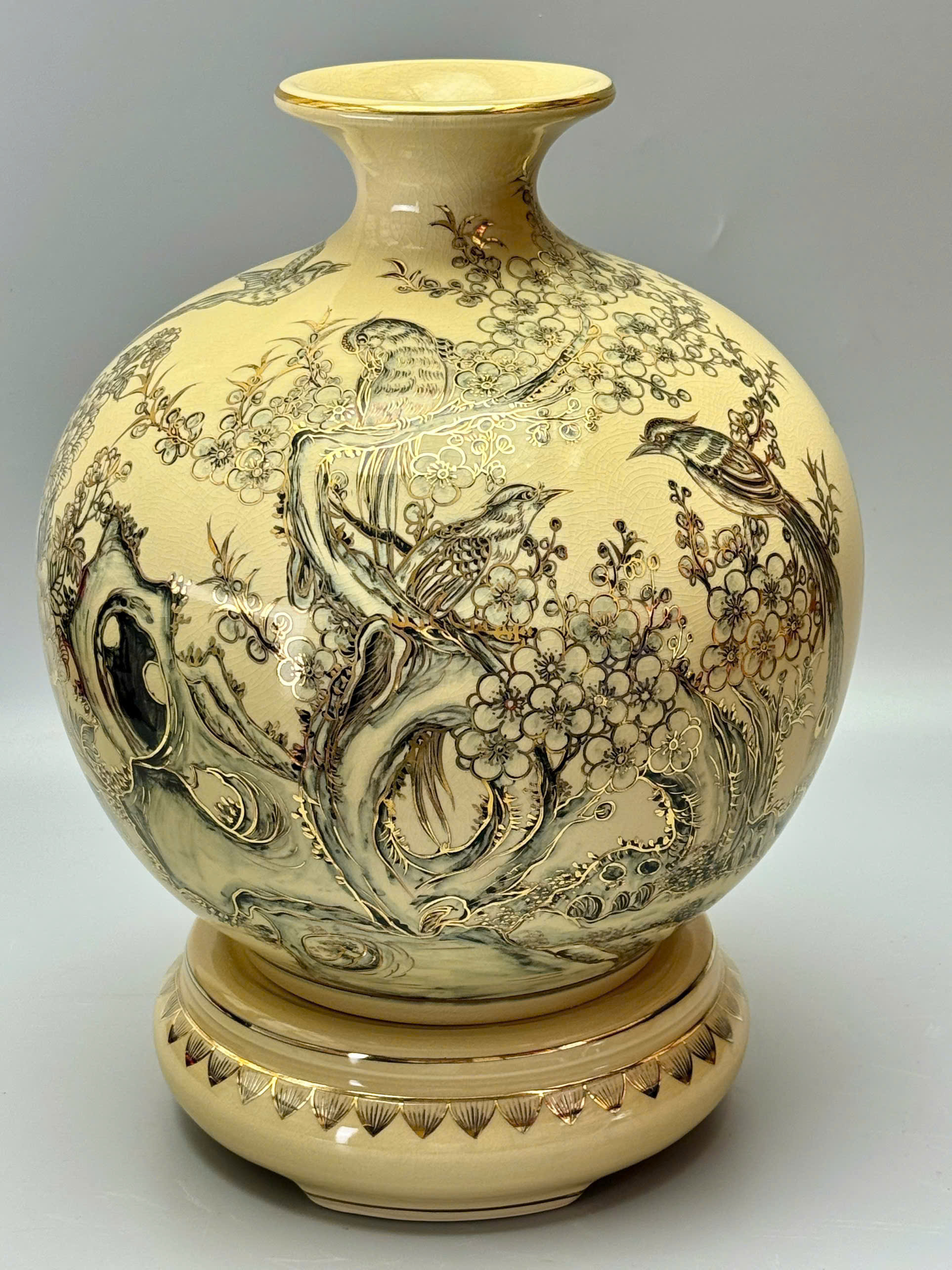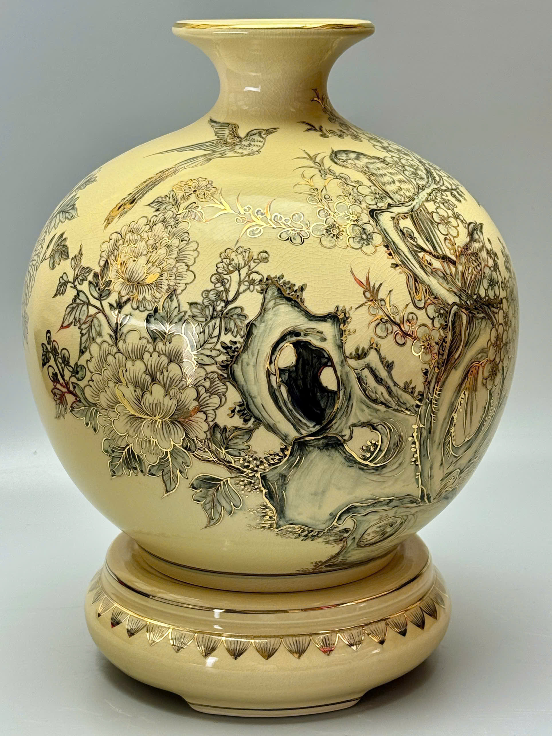 Từ khóa chính: bình hút tài lộc chim đào, gốm Chu Đậu, vẽ vàng 24K, bình phong thủy, men rạn cao cấp
