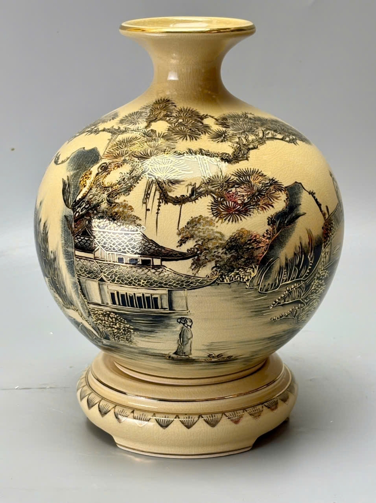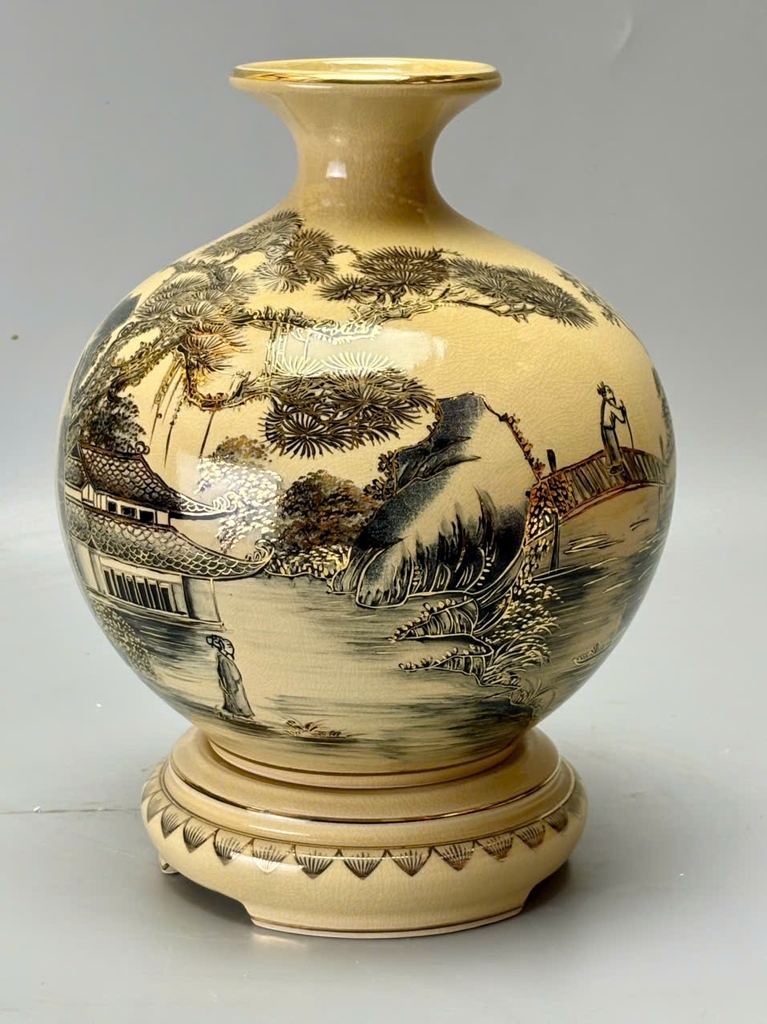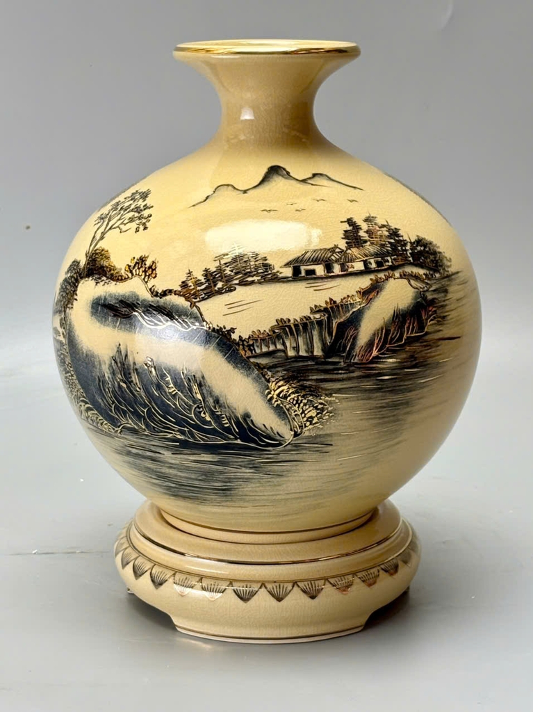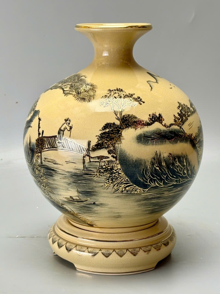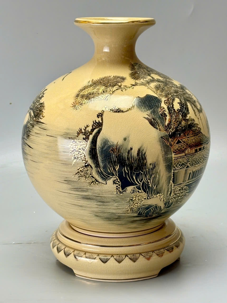 Chiếc bình hút tài lộc H25 mang dáng tròn đầy, cổ thon miệng nhỏ – biểu tượng phong thủy giúp giữ tài lộc và chiêu vượng khí. Trên nền men rạn cổ truyền, cảnh sơn thủy hữu tình được tái hiện sinh động: núi non trùng điệp, sông nước hiền hòa, cây cối xanh tươi… Tất cả được vẽ tay thủ công và điểm xuyết vàng 24K, tạo nên một tuyệt phẩm vừa nghệ thuật vừa mang giá trị tâm linh sâu sắc.