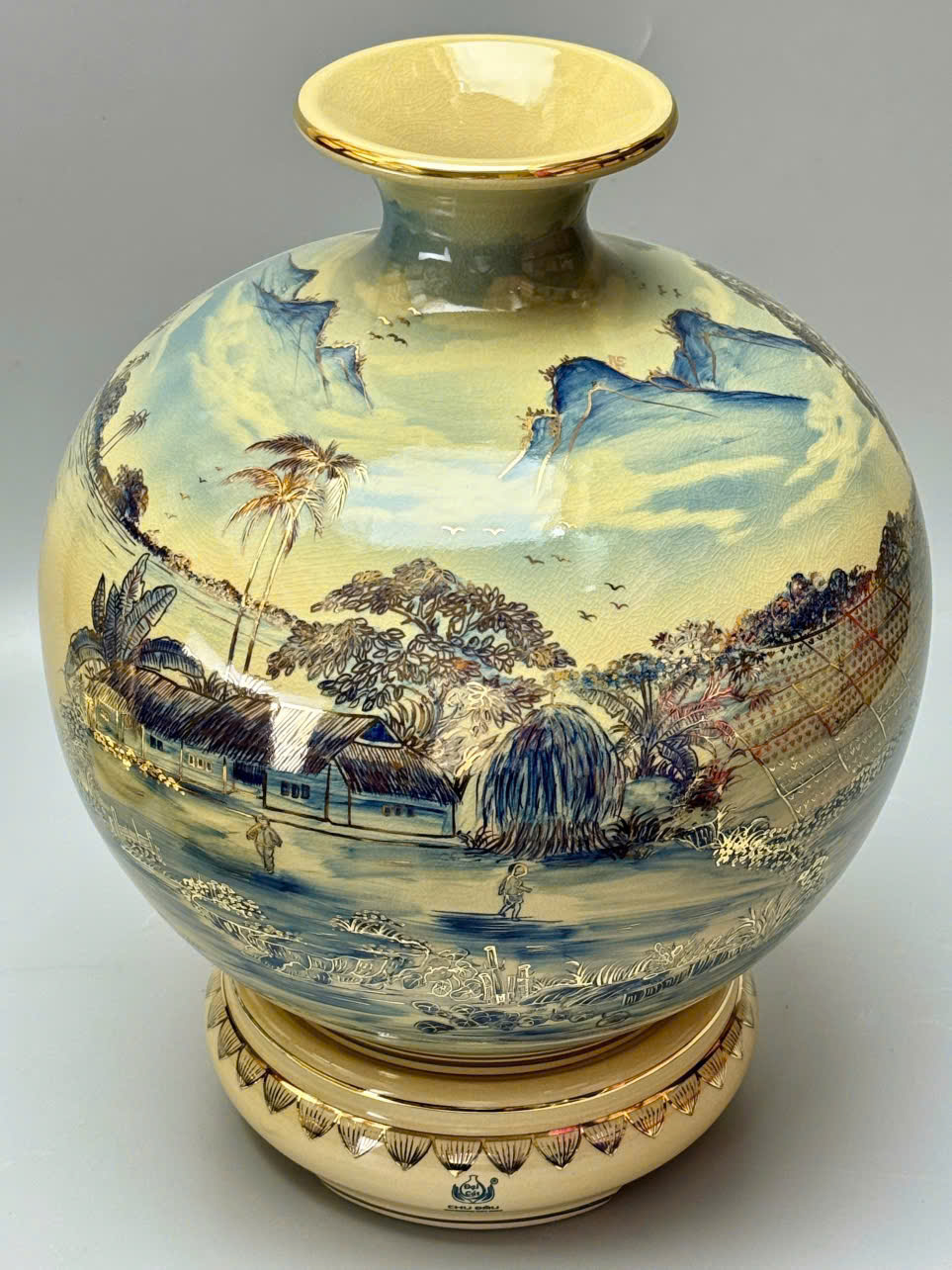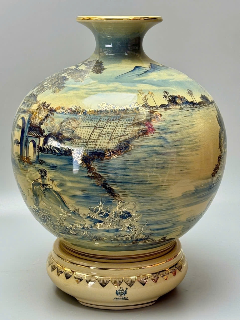 Bình hút tài lộc H35 và H40 là hiện thân của vẻ đẹp truyền thống Việt, kết hợp hài hòa giữa nghệ thuật gốm Chu Đậu cổ truyền và giá trị phong thủy sâu sắc. Trên nền men xanh coban đặc trưng, cảnh làng quê sơn thủy hữu tình hiện lên sống động: mái nhà tranh nép mình bên dòng sông, cây đa cổ thụ, ruộng lúa vàng óng, núi đồi trập trùng… Tất cả được vẽ tay thủ công và điểm xuyết vàng 24K, tạo nên một tuyệt phẩm vừa mang tính nghệ thuật, vừa chiêu tài chiêu lộc.