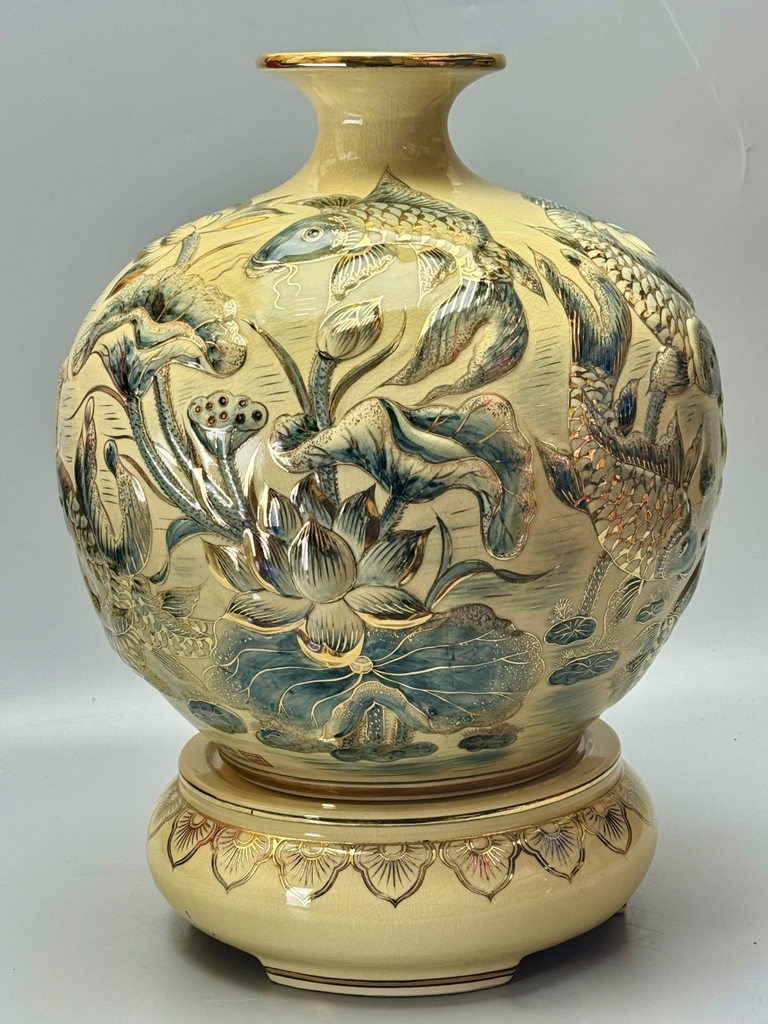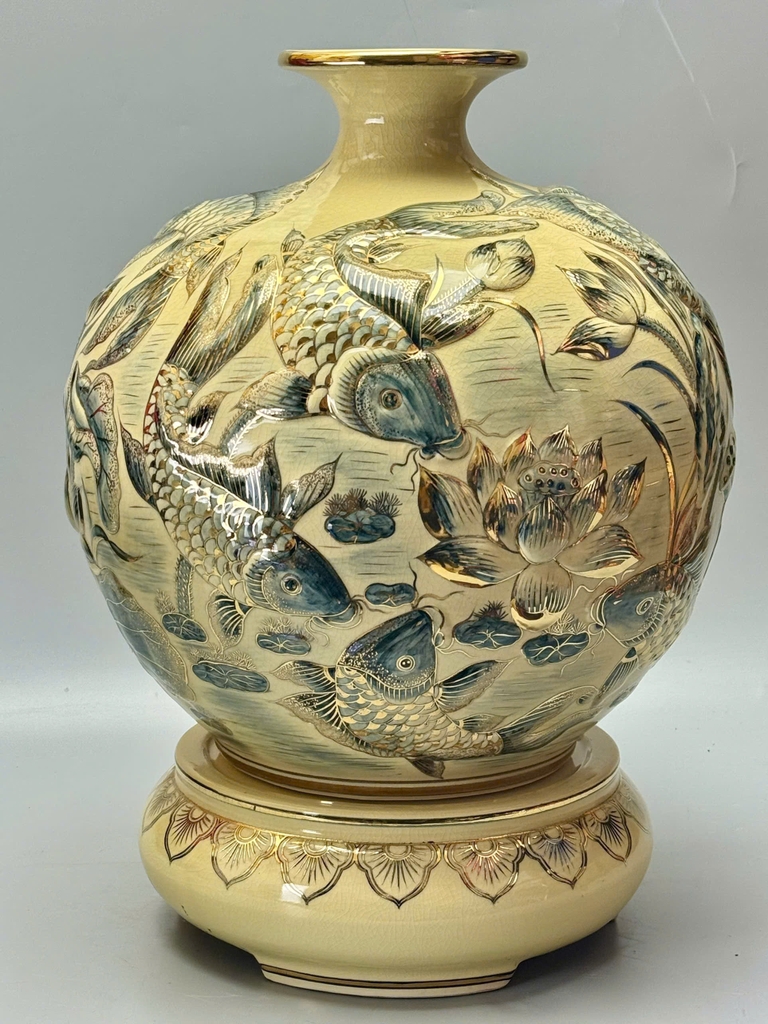🏺 Bình Hút Tài Lộc H45 Cửu Ngư Hoa Sen Khắc Nổi Vẽ Vàng – Gốm Chu Đậu