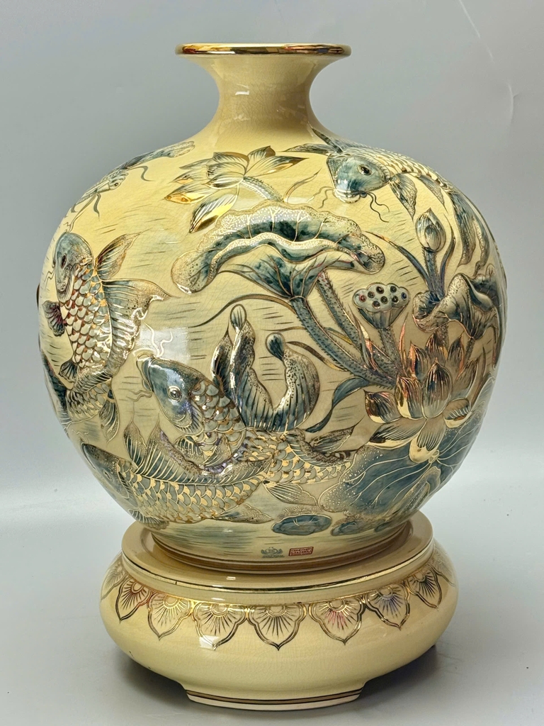 Bình hút tài lộc H45 cửu ngư hoa sen khắc nổi vẽ vàng là dòng sản phẩm gốm sứ cao cấp đến từ làng nghề truyền thống Chu Đậu – Hải Dương, nổi tiếng với kỹ thuật chế tác tinh xảo và giá trị phong thủy sâu sắc. Với chiều cao 45cm, bình có thiết kế cân đối, sang trọng, phù hợp trưng bày trong không gian sống hoặc làm quà tặng ý nghĩa.
