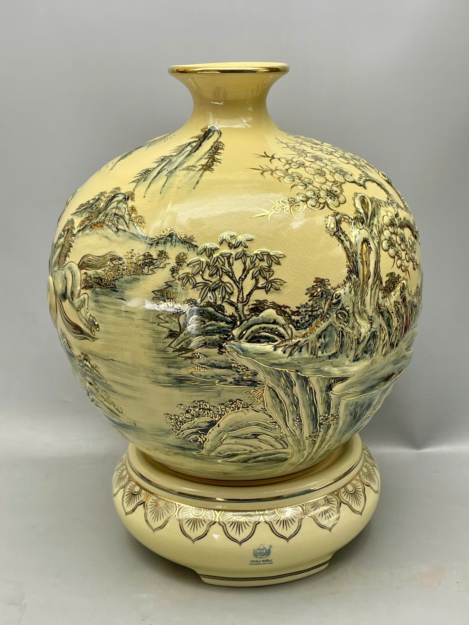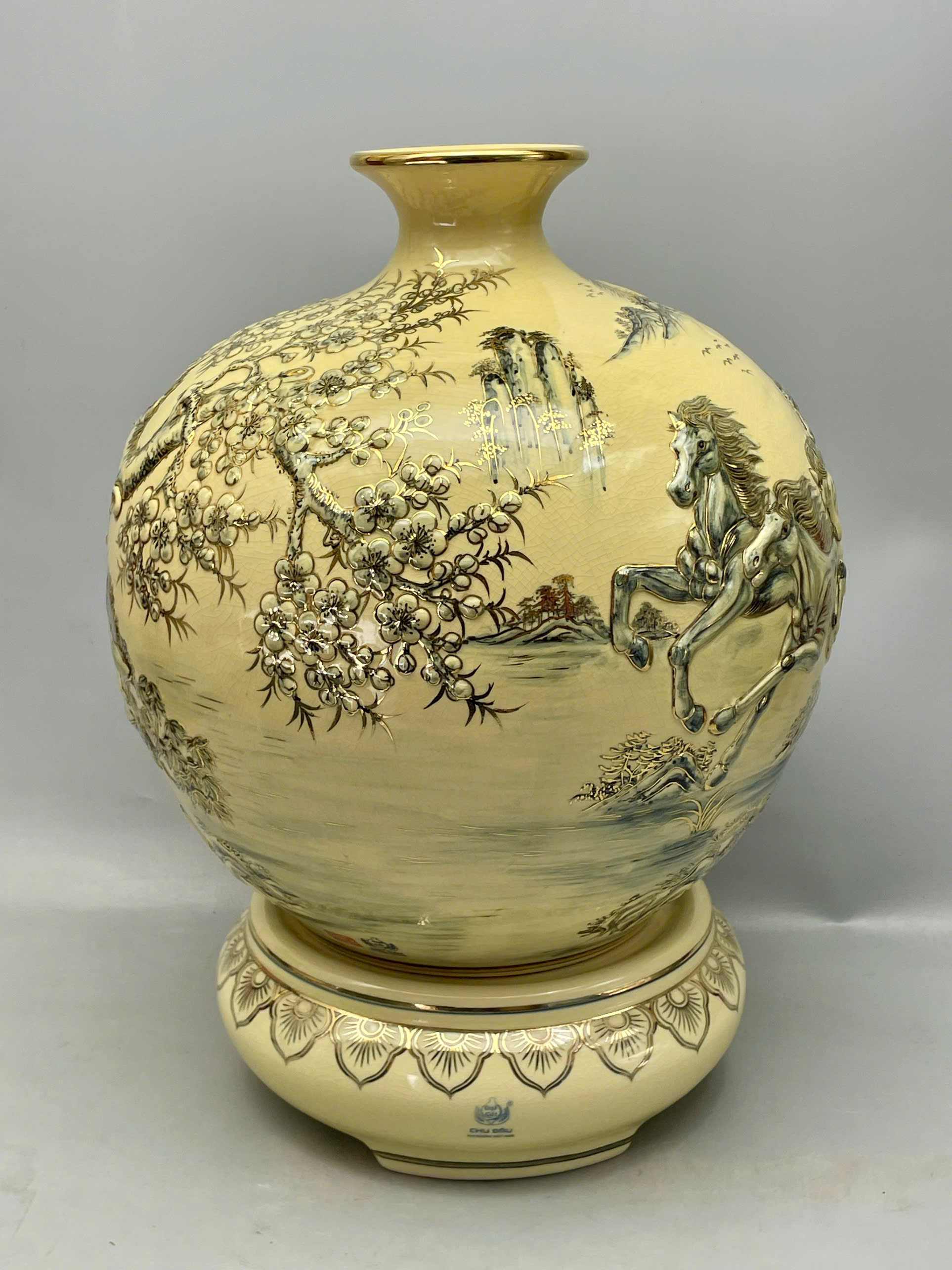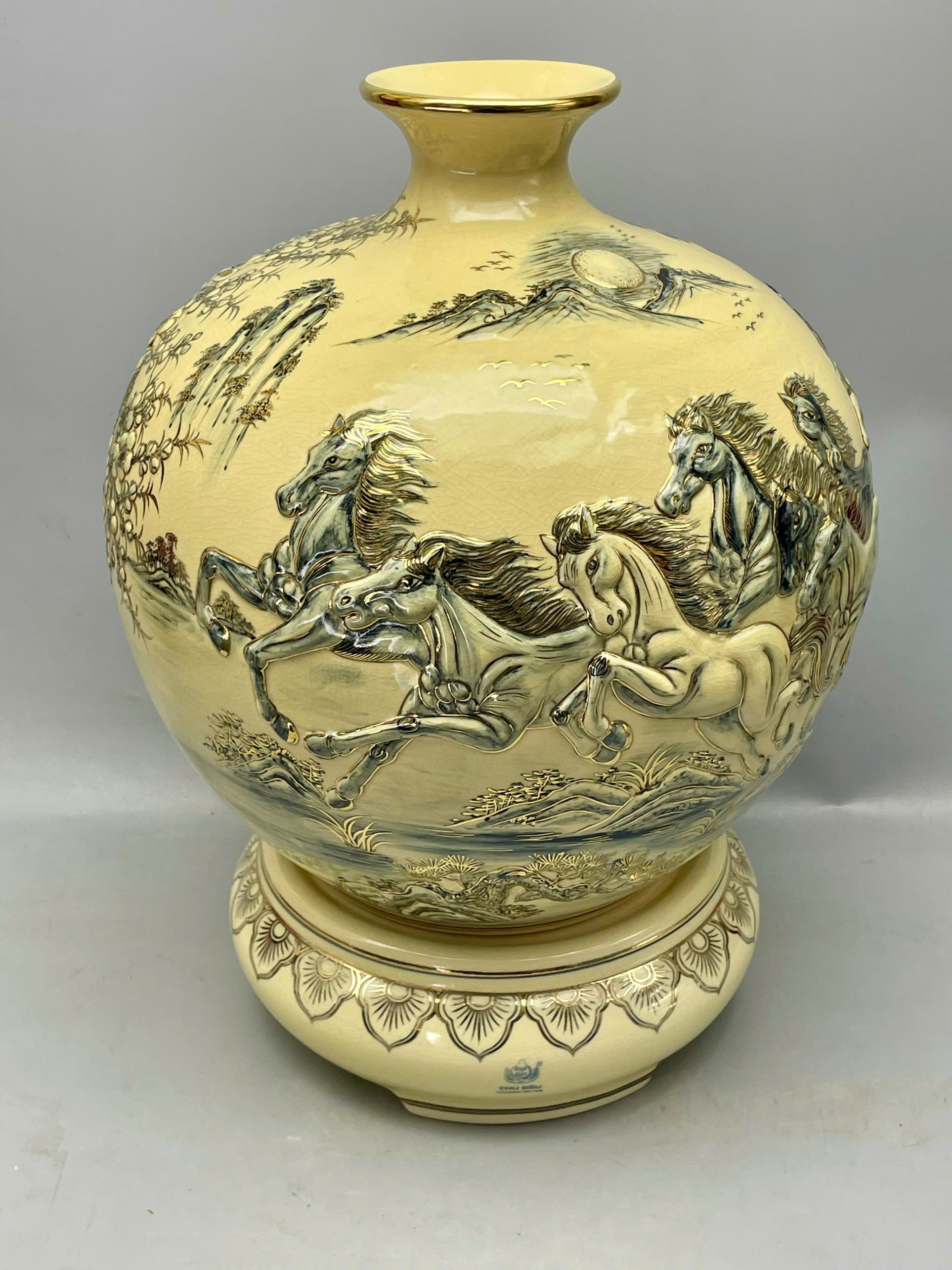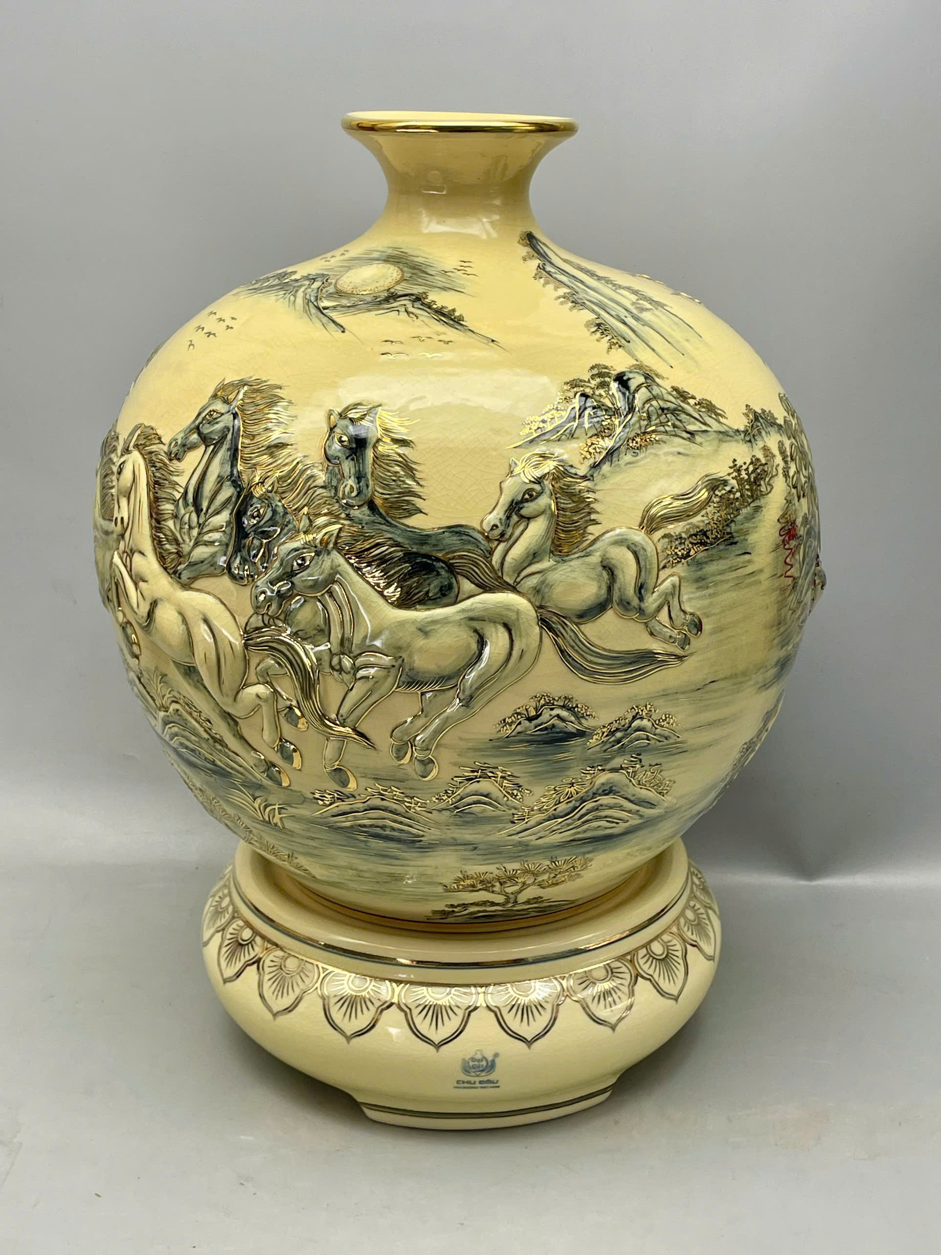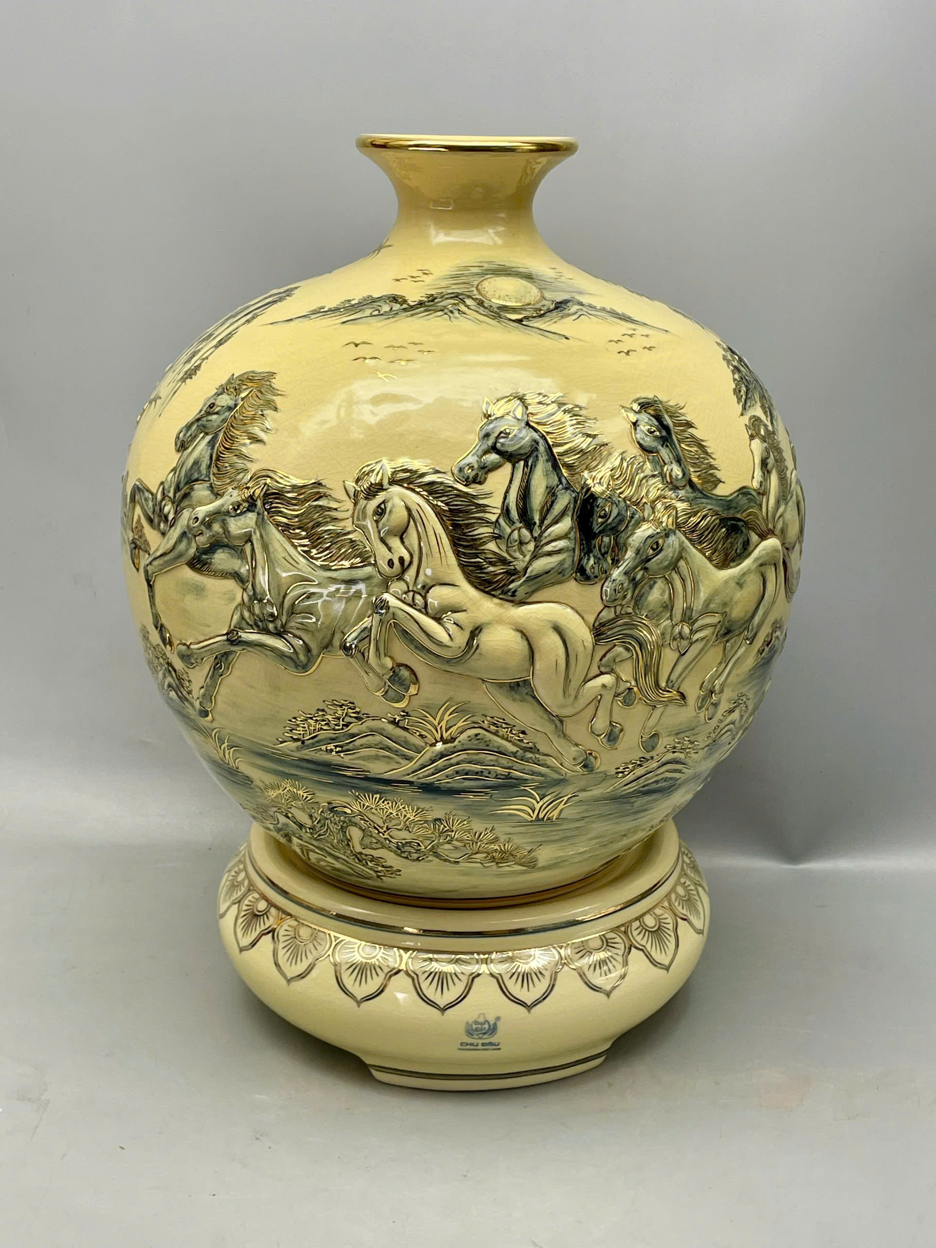 Bình hút tài lộc mã đáo thành công đắp nổi H45 vẽ vàng 24k gốm Chu Đậu