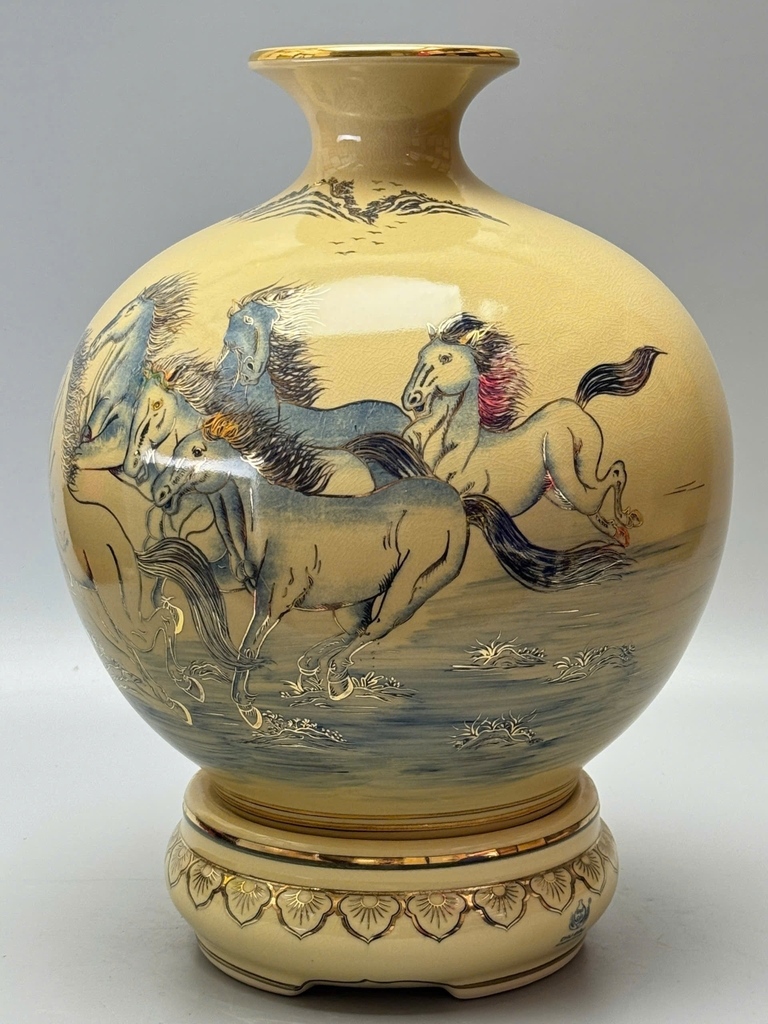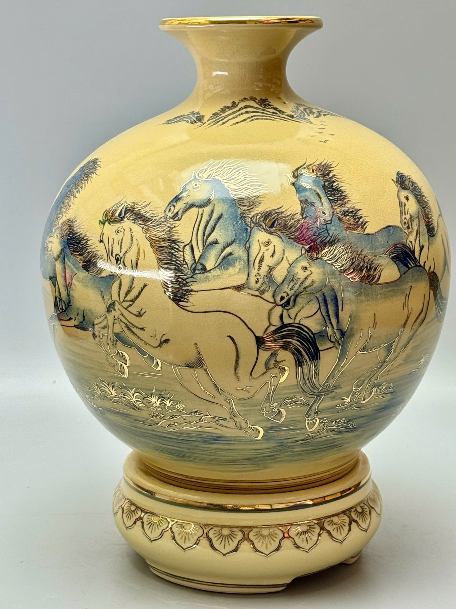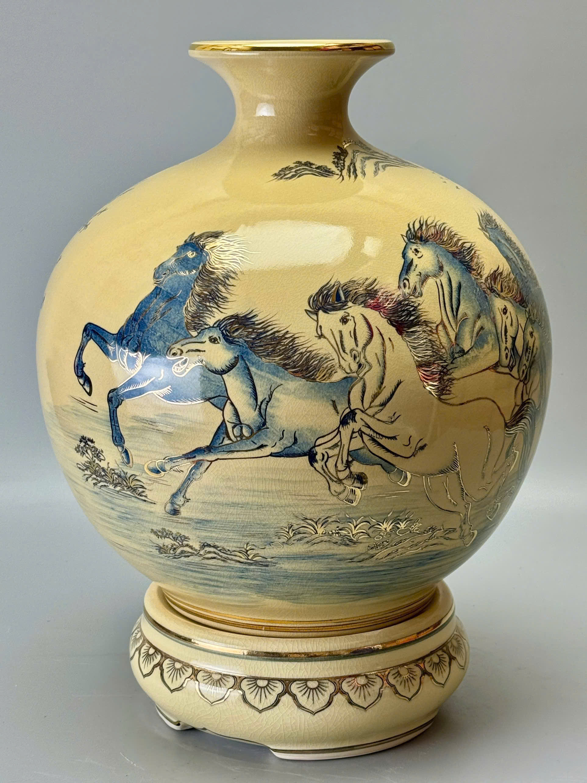 Từ khóa chính: bình hút tài lộc mã đáo thành công, gốm Chu Đậu, xanh coban, vẽ vàng 24K, bình phong thủy, men rạn cao cấp