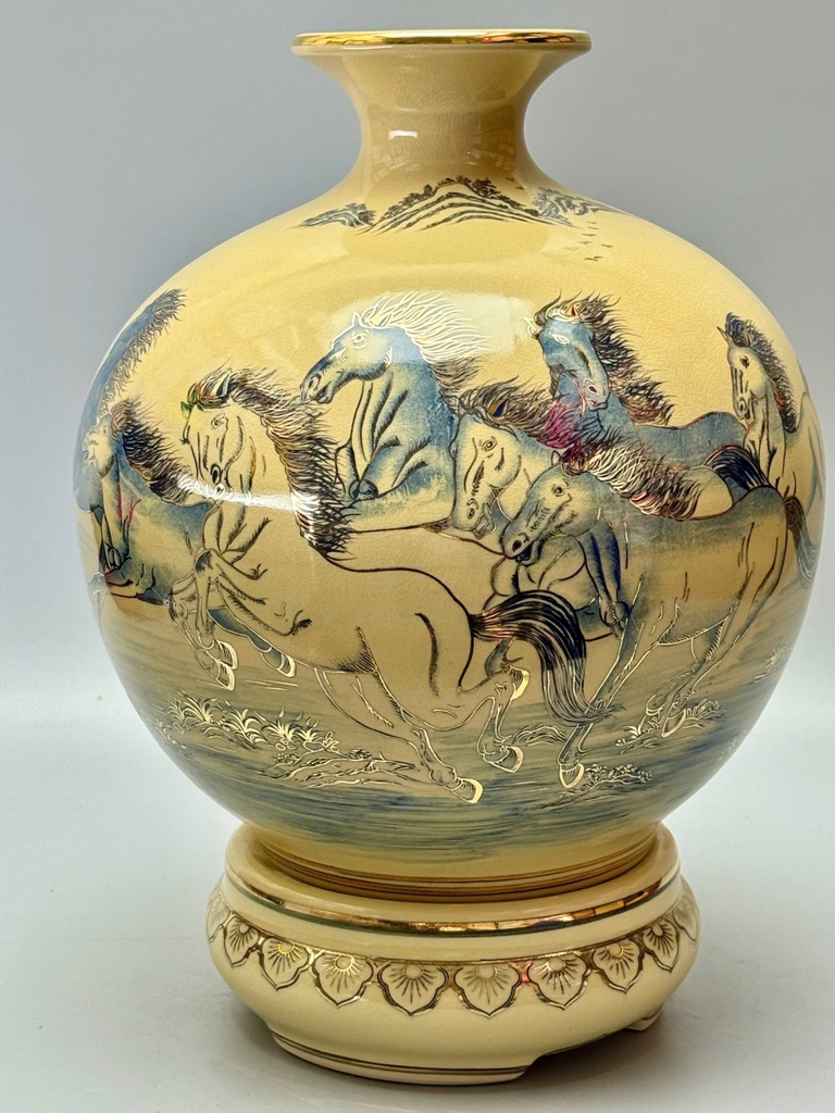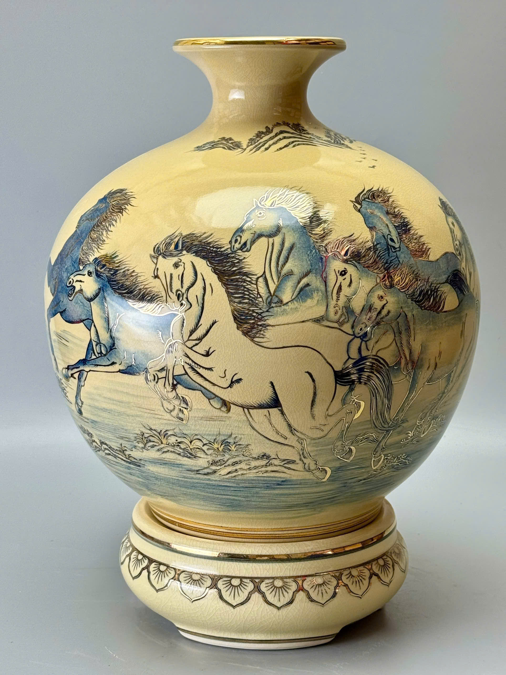 Bình hút tài lộc Mã Đáo Thành Công xanh coban vẽ vàng 24K là dòng sản phẩm gốm sứ phong thủy cao cấp, mang biểu tượng của sự thành công, thăng tiến và vượng khí. Hình ảnh bát mã phi nước đại – tám chú ngựa mạnh mẽ tiến về một hướng – được thể hiện sống động trên nền men rạn xanh coban cổ kính, kết hợp với kỹ thuật vẽ vàng 24K thủ công tinh xảo, tạo nên vẻ đẹp sang trọng và đầy ý nghĩa.