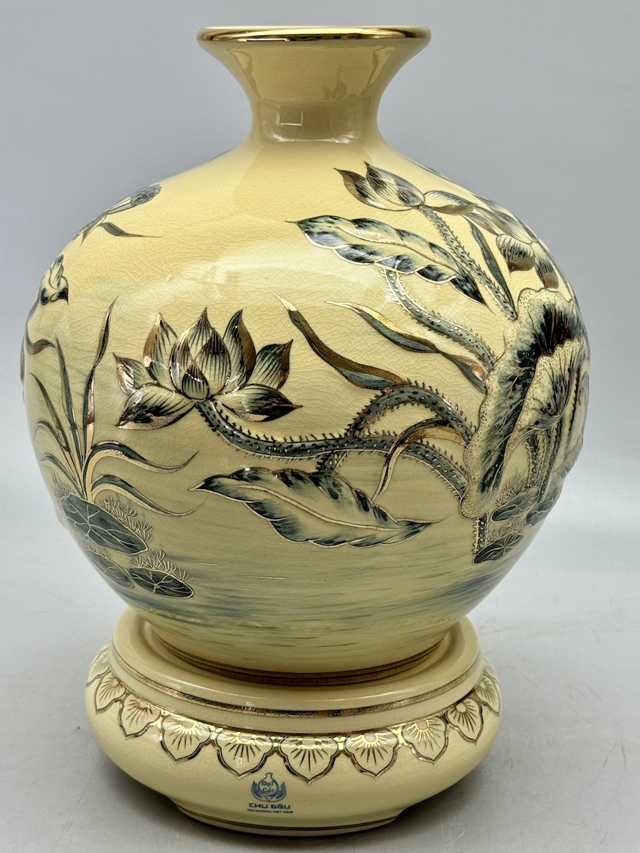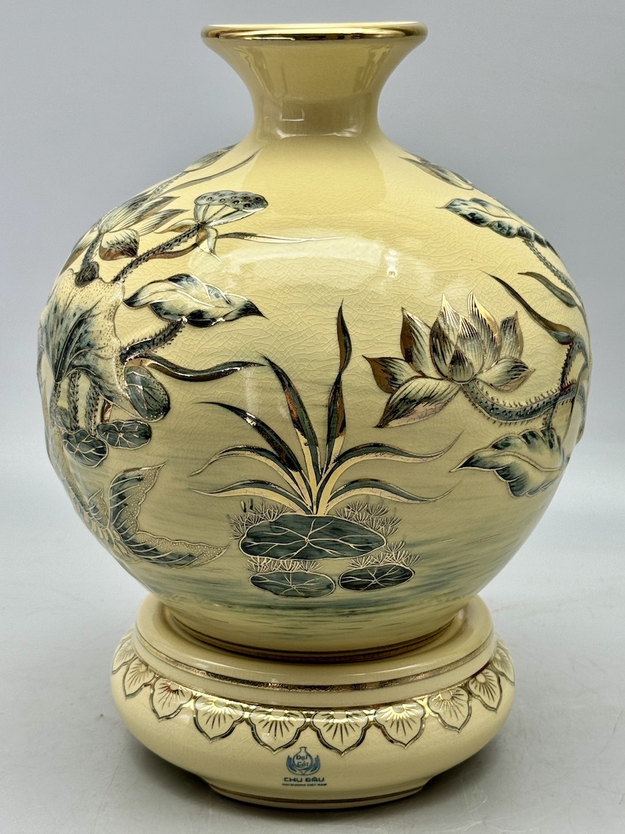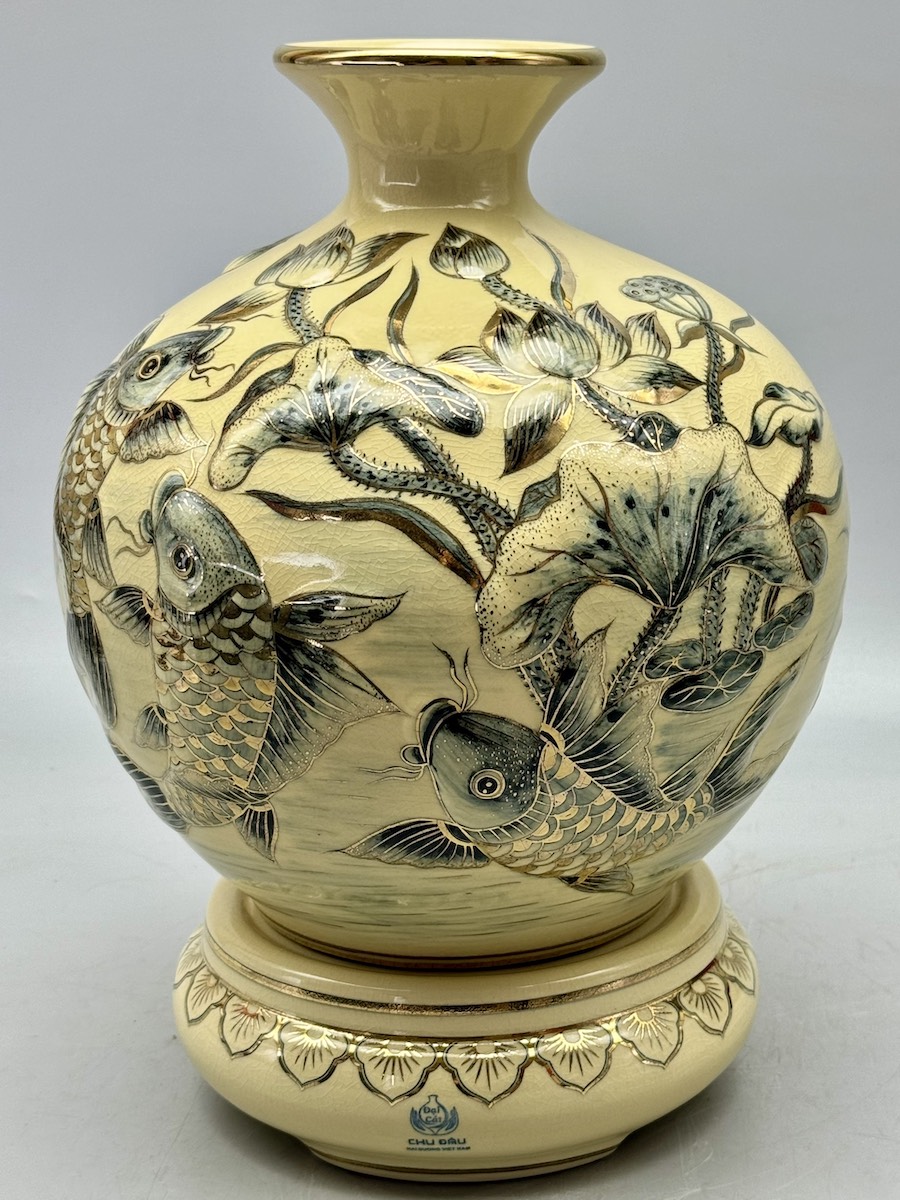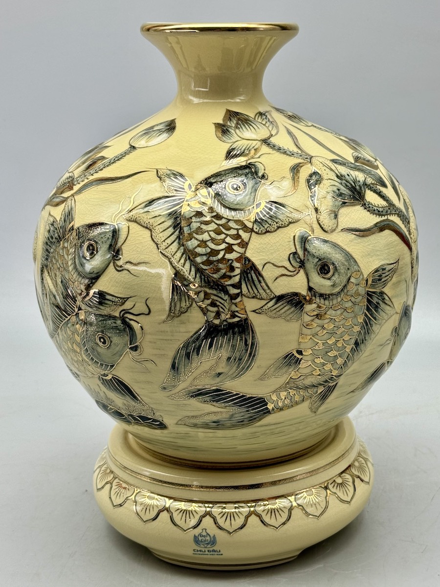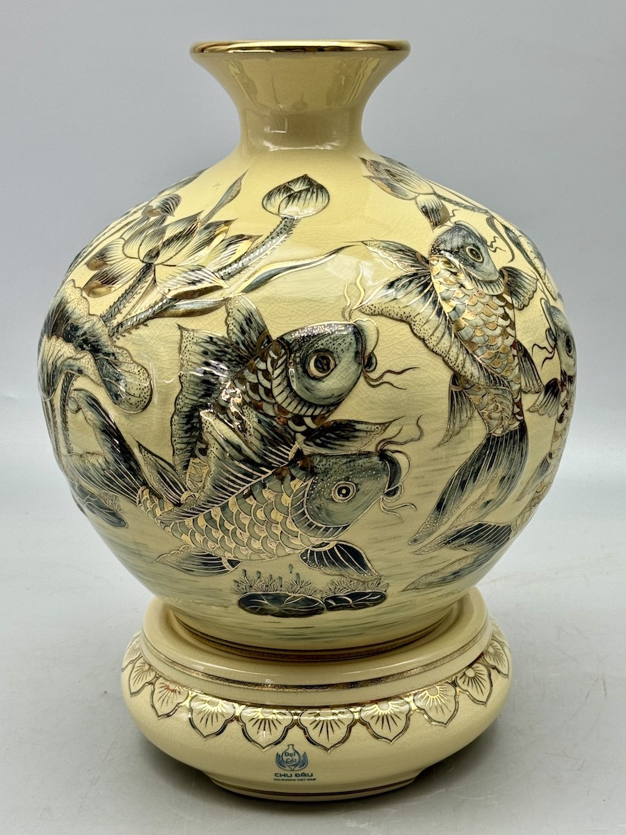 Bình Tài Lộc Cá Chép Hoa Sen Đắp Nổi Cao 36cm Gốm Chu Đậu Vẽ Vàng