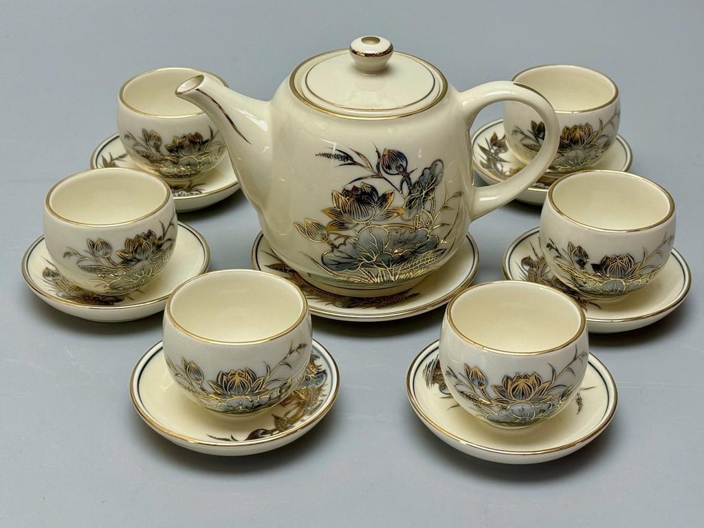 Bộ ấm trà tròn hoa sen là tuyệt phẩm gốm Chu Đậu, mang dáng ấm tròn truyền thống – biểu tượng của sự viên mãn, hài hòa và gắn kết. Trên nền men trắng ngà thanh khiết, hình ảnh hoa sen – loài hoa của sự thanh cao, thuần khiết và trí tuệ – được vẽ tay bằng vàng thật 24K, tạo nên vẻ đẹp sang trọng, tinh tế và đầy ý nghĩa phong thủy.