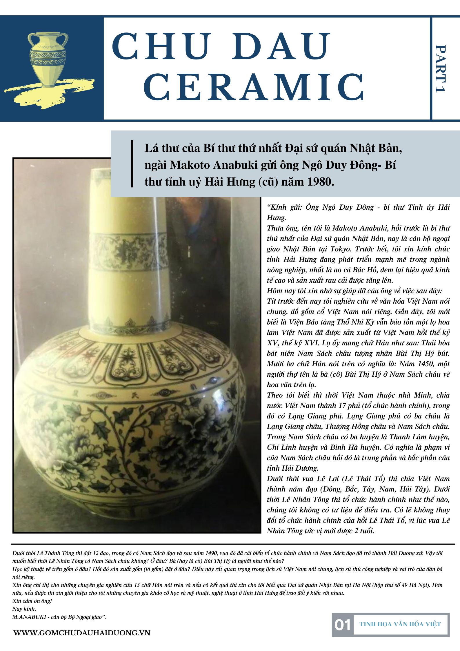 Chuyện hồi sinh của làng gốm cổ Chu Đậu bắt nguồn từ một lá thư của Bí thư thứ nhất Đại sứ quán Nhật Bản, ngài Makoto Anabuki gửi ông Ngô Duy Đông- Bí thư tỉnh uỷ Hải Hưng (cũ) năm 1980. Bức thư viết : Trong một chuyến công tác tới Thổ Nhĩ Kỳ, ông có dịp vào thăm bảo tàng Topkapi Saray ở thủ đô Istanbul và đã thích thú chiêm ngưỡng bình gốm hoa lam cổ cao 54cm của Việt Nam- báu vật của Thổ Nhĩ Kỳ được mua bảo hiểm với giá 1triệu USD. Trên bình có ghi 13 chữ Hán "Thái Hoà bát niên, Nam Sách châu, tượng nhân Bùi Thị Hý bút". Nghĩa là năm Thái Hoà thứ 8 (1450), thợ gốm họ Bùi, người châu Nam Sách vẽ chơi. Ông Anabuki đã nhờ ông Bí thư tỉnh uỷ xác định cho ngài vào thời vua Lê Nhân Tông có Nam Sách châu không? Ở đâu? Bà (hay cô) Bùi Thị Hý là người như thế nào? Học kĩ thuật vẽ gốm ở đâu? Hồi đó sản xuất gốm đặt ở đâu? Điều này rất quan trọng trong lịch sử Việt Nam nói chung, lịch sử thủ công nghiệp và vai trò của người phụ nữ Việt Nam nói riêng.