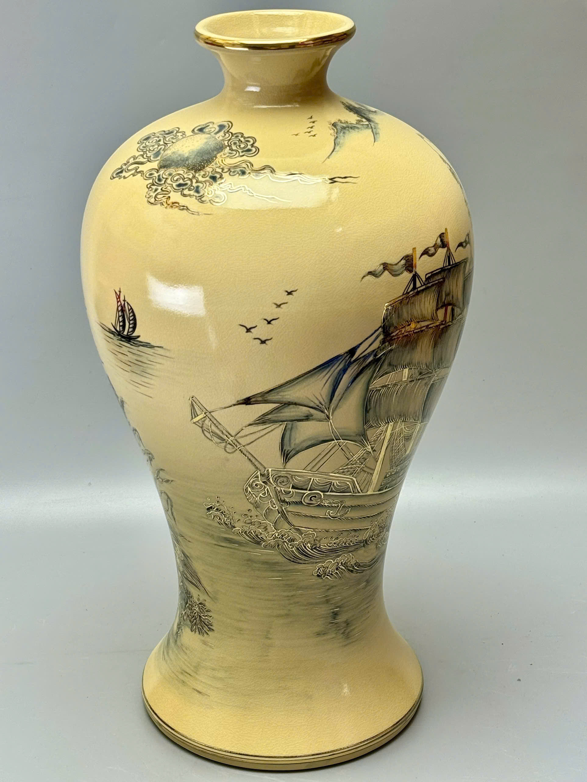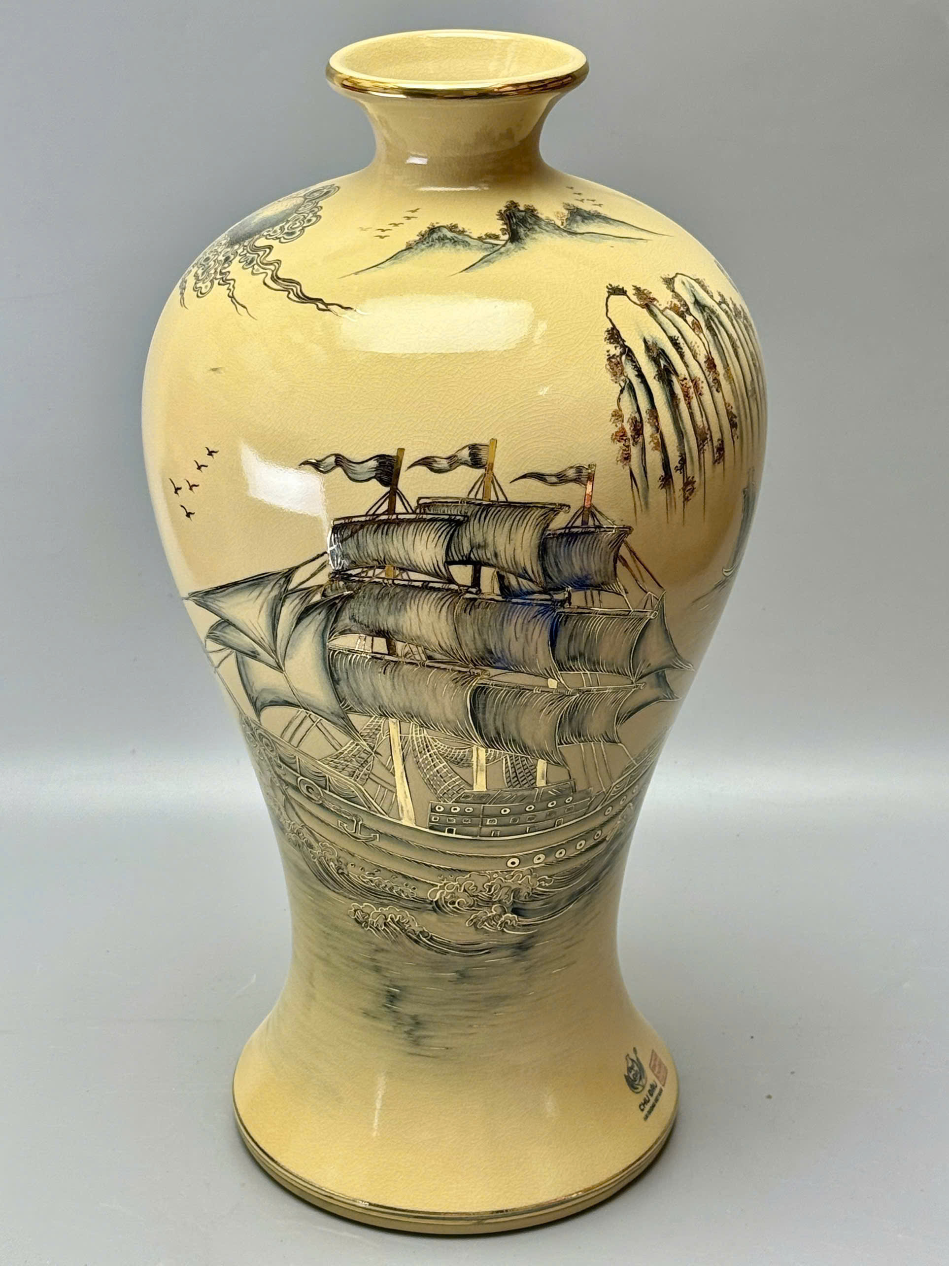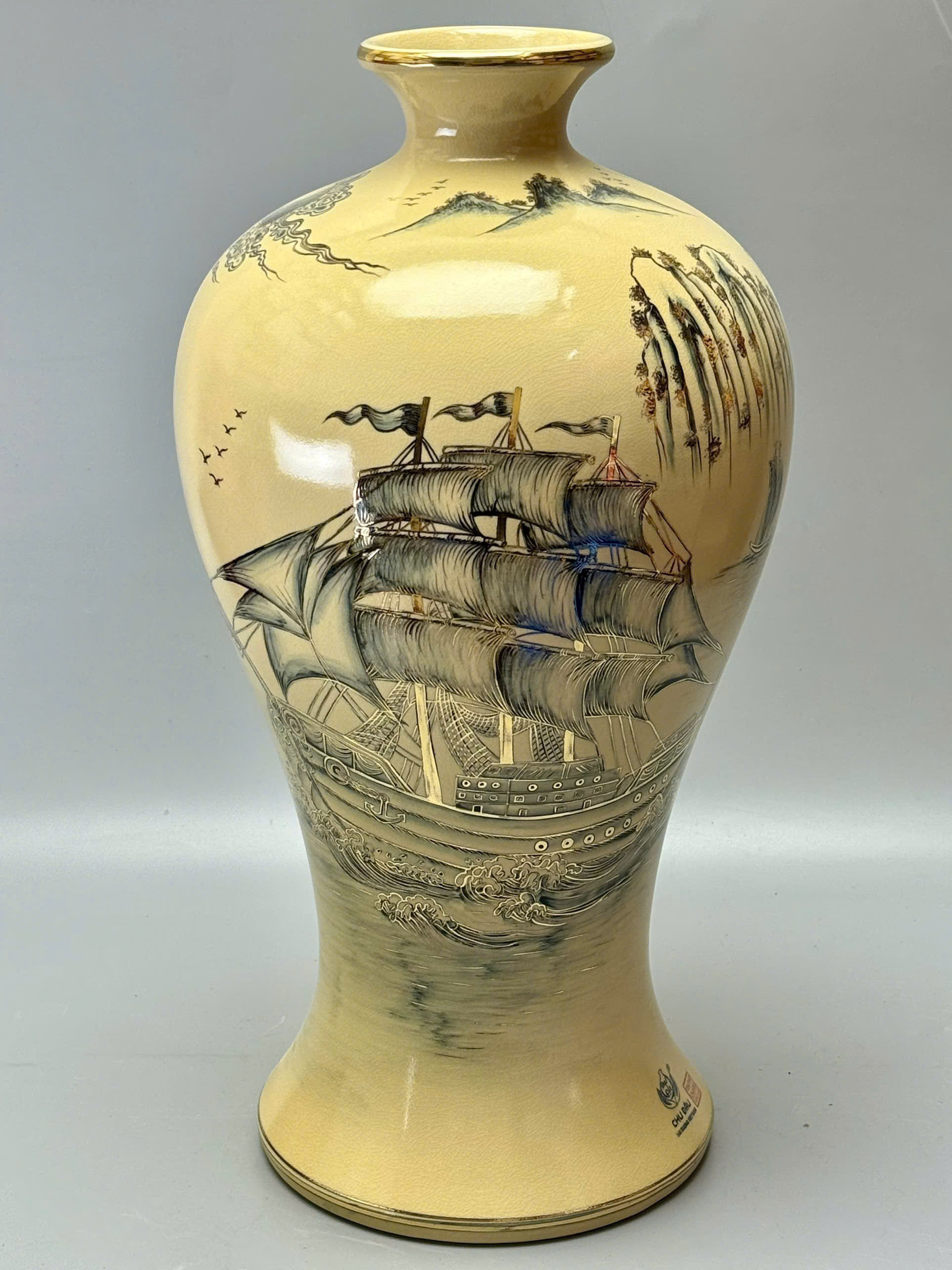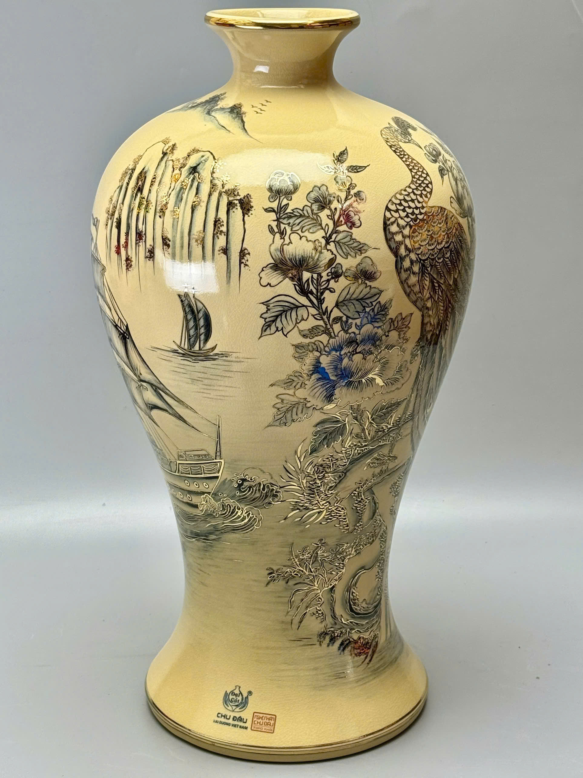 Mai bình Thuận Buồm Xuôi Gió – Công Thành Danh Toại là tuyệt phẩm gốm sứ phong thủy cao cấp đến từ làng nghề truyền thống Chu Đậu – Hải Dương, mang thông điệp mạnh mẽ về sự hanh thông, thành công và thịnh vượng. Với chiều cao 60cm, dáng mai bình uy nghi, sản phẩm được chế tác thủ công, khắc họa tinh xảo và vẽ vàng 24K sang trọng, phù hợp trưng bày trong không gian sống hoặc làm quà tặng đẳng cấp.