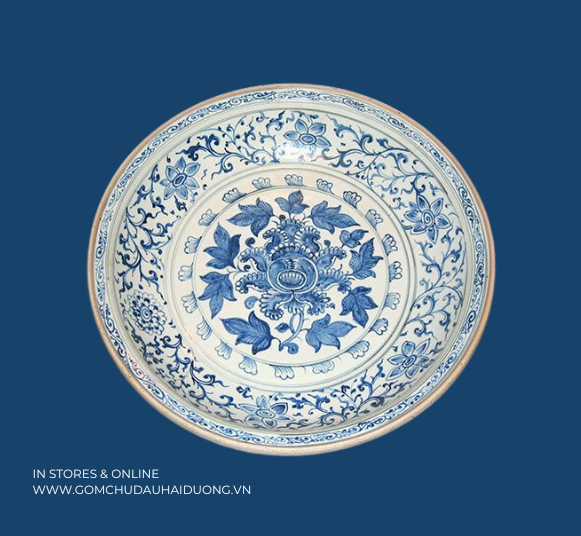 Chiếc đĩa có đường kính khoảng 32 cm, tình trạng hoàn hảo. Lòng đĩa vẽ hoa cúc và 2 dải hồi văn hoa lá.