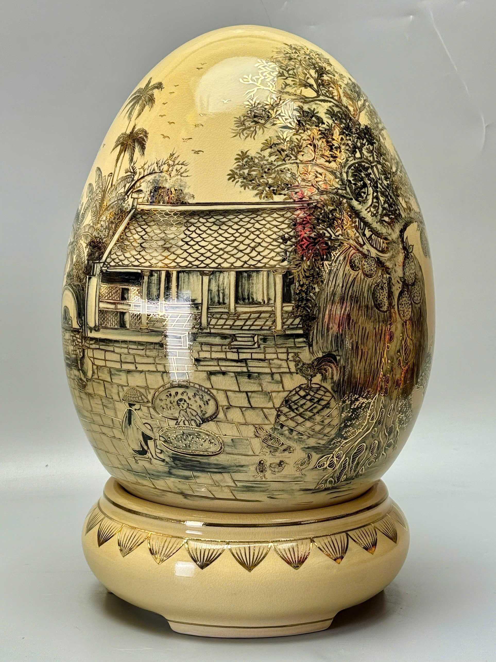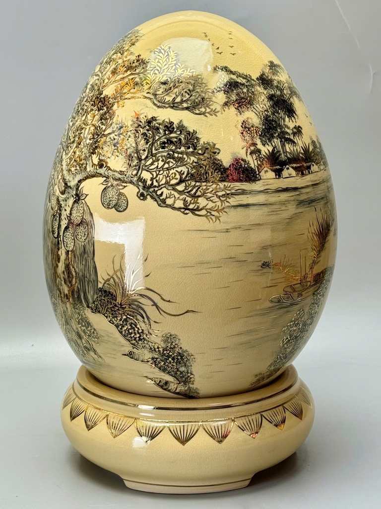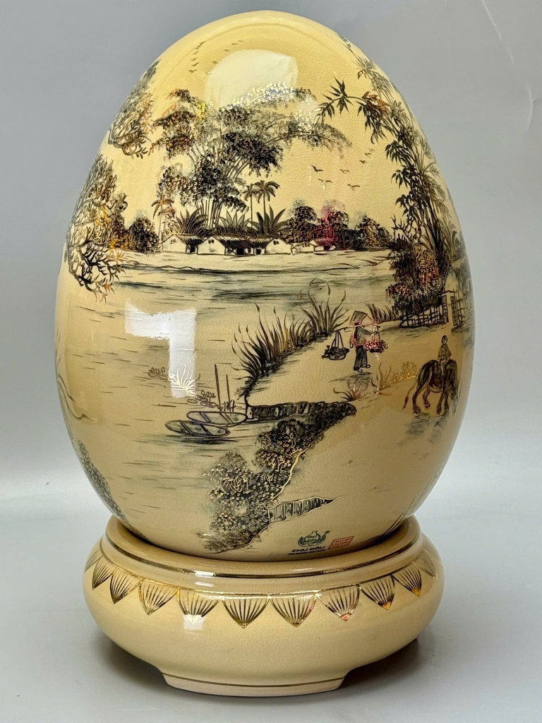 Trứng Tài Lộc Phong Cảnh Làng Quê Việt Nam Xưa – Cao 55cm – Gốm Chu Đậu Vẽ Vàng 24K