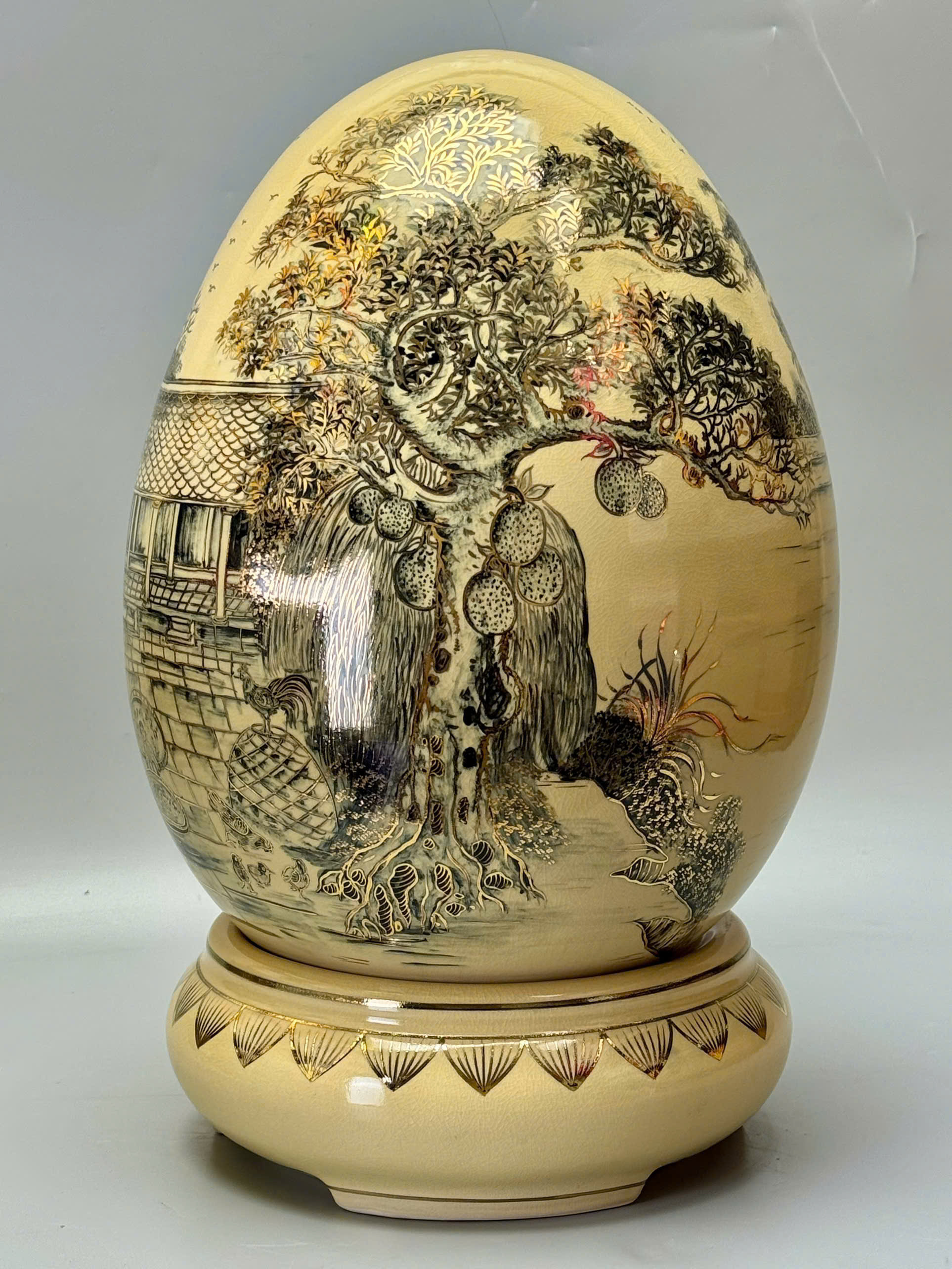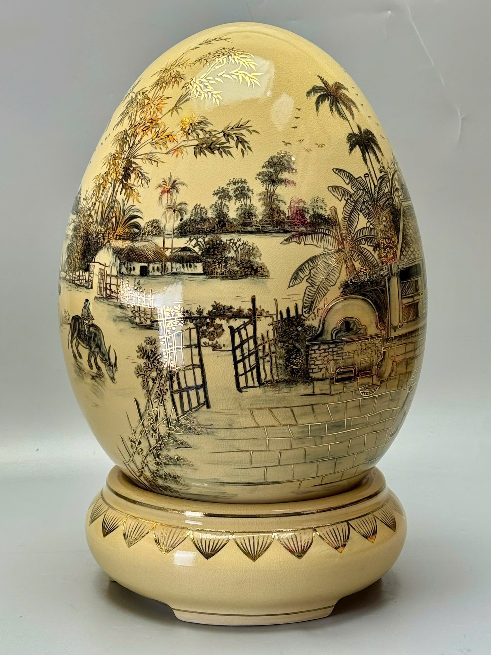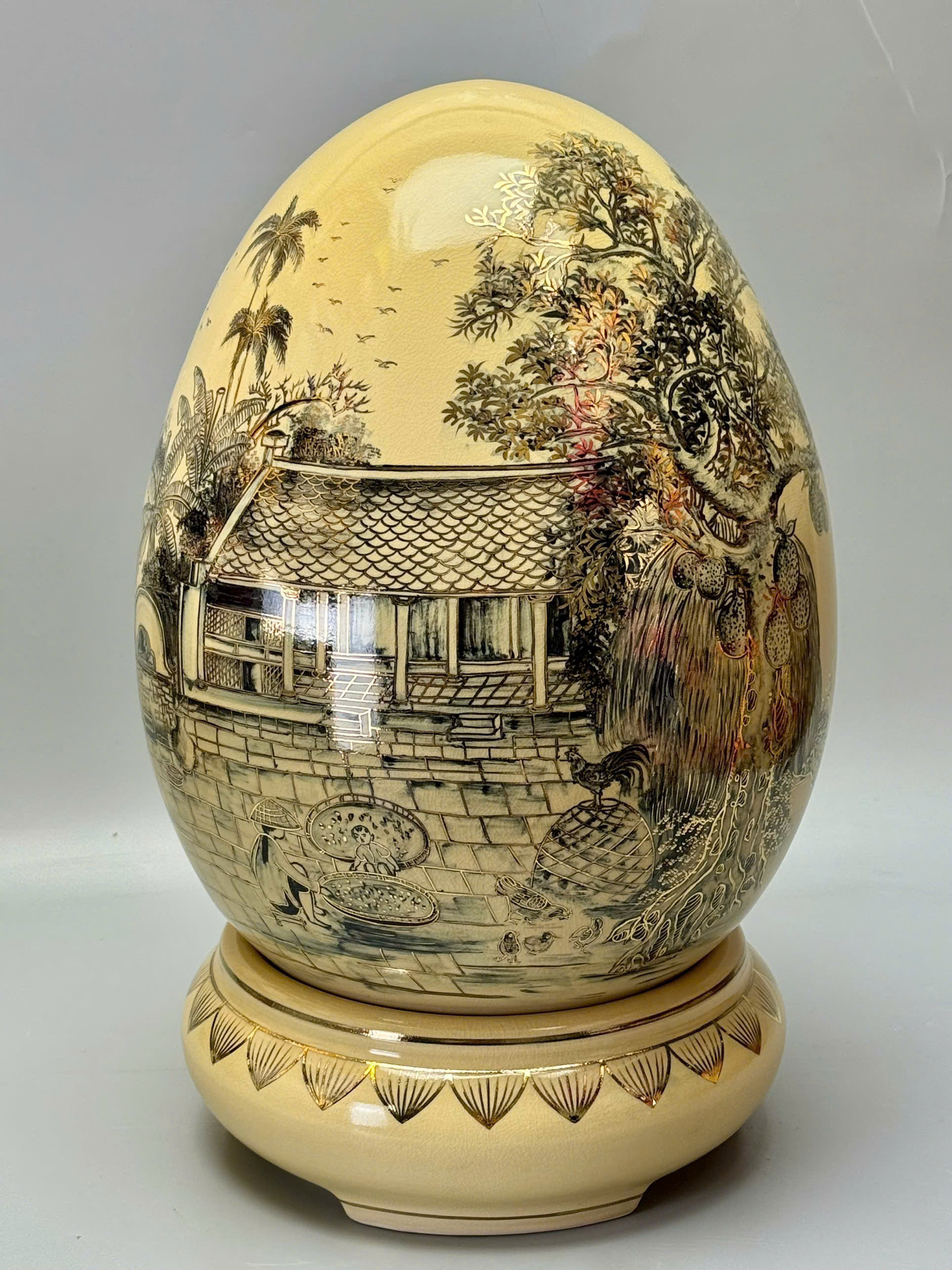 Trứng Tài Lộc Phong Cảnh Làng Quê Việt Nam Xưa – Cao 55cm – Gốm Chu Đậu Vẽ Vàng 24K